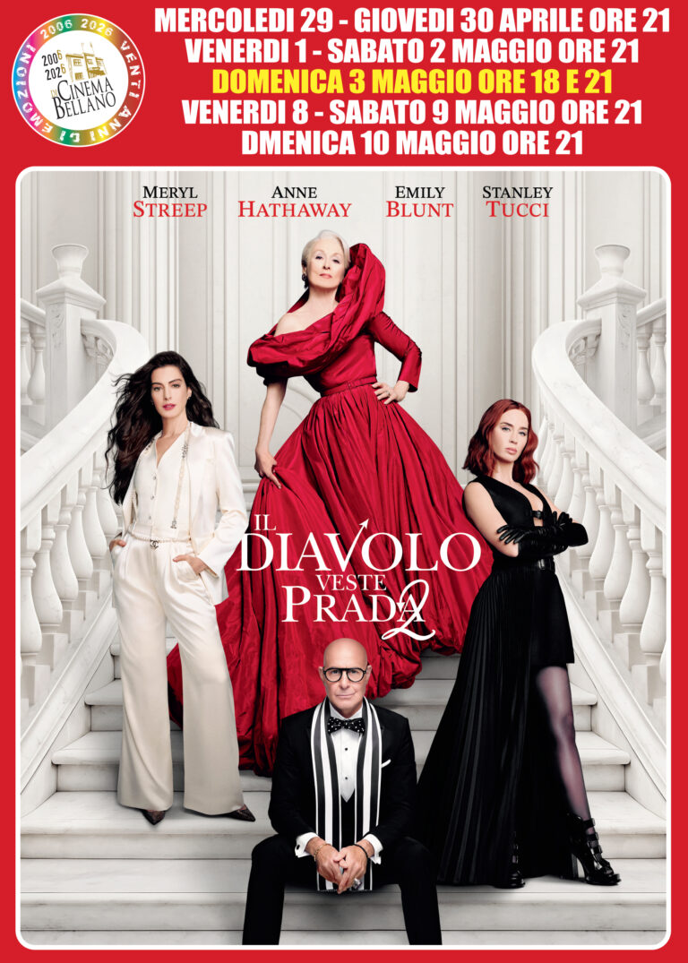 Mercoledì 29 e giovedì 30 aprile ore 21. Venerdì 1 e sabato 2 maggio ore 21. Domenica 3 maggio ore 18 e 21. Venerdì 8, sabato 9 e domenica 10 maggio sempre ore 21 al Cinema di Bellano.