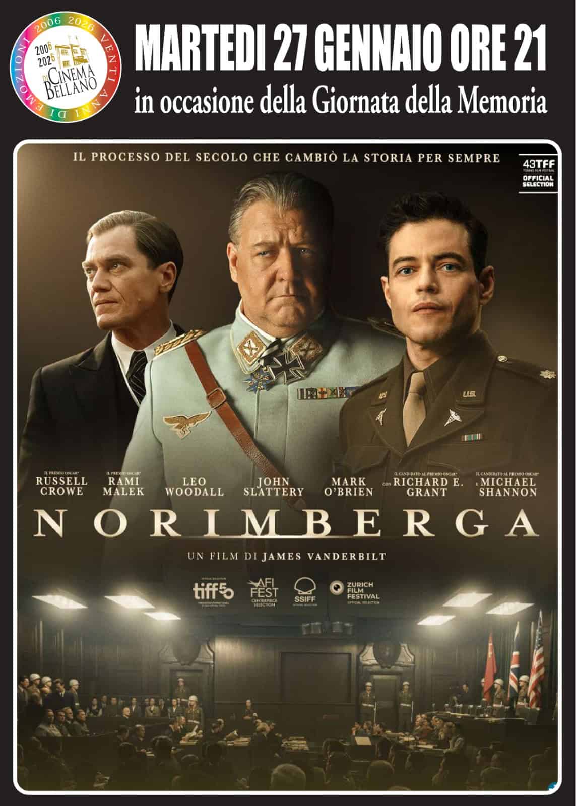 Martedì 27 gennaio ore 21:00 al Cinema di Bellano in occasione della Giornata della Memoria. All'indomani della Seconda guerra mondiale, mentre il mondo è ancora sconvolto dagli orrori dell'Olocausto, al tenente colonnello Douglas Kelley, psichiatra dell'esercito americano, viene affidato un incarico senza precedenti: valutare la sanità mentale di Hermann Göring, il famigerato ex braccio destro di Hitler, e di altri alti gerarchi nazisti. Allo stesso tempo, gli Alleati - guidati dal giudice Robert H. Jackson, affrontano l'impresa titanica di istituire un tribunale internazionale, per far sì che il regime nazista risponda dei propri crimini di fronte alla storia. Nel silenzio...